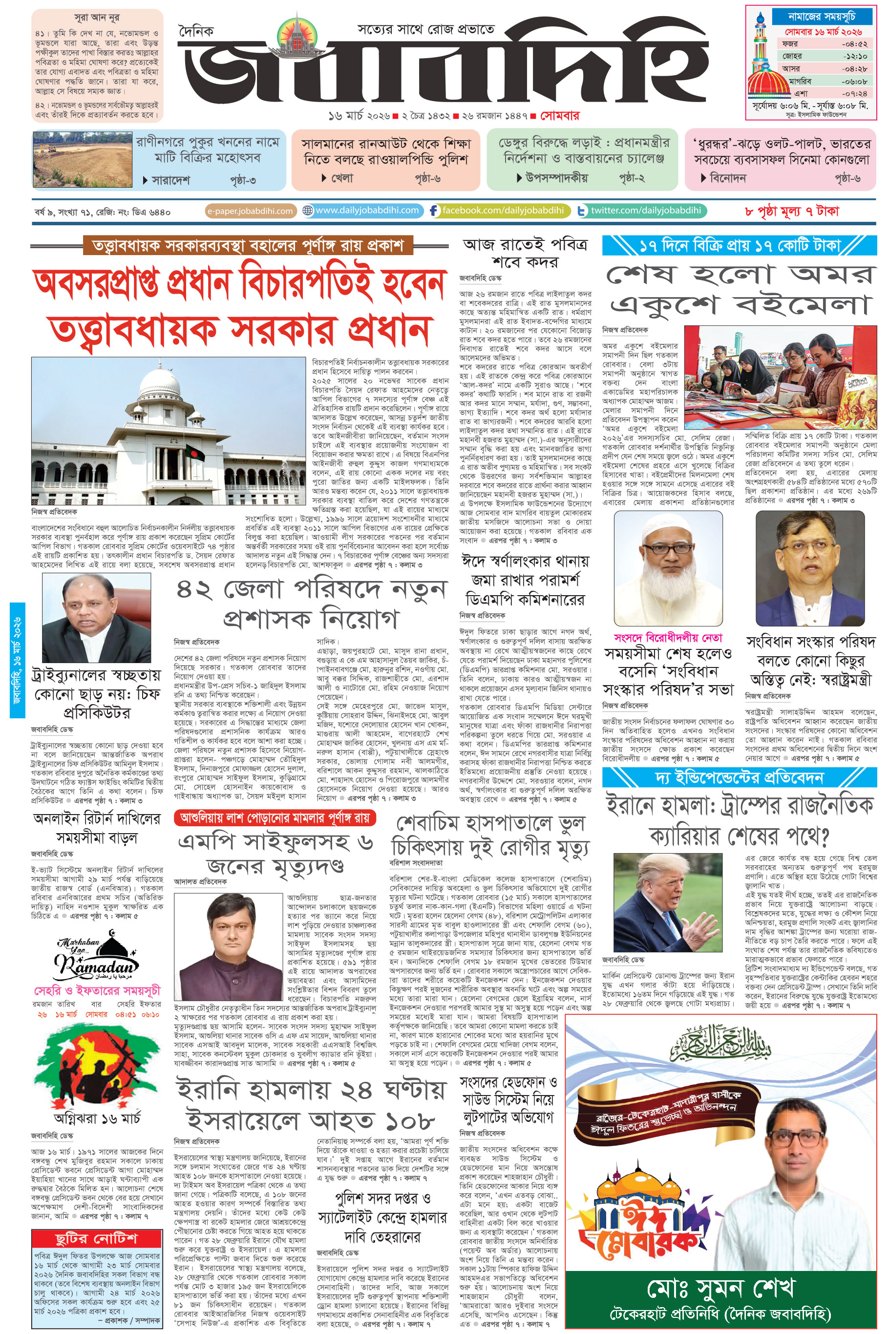 বার্তা ও বাণিজ্যিক বিভাগ : প্রকাশক কর্তৃক ৮২, শহীদ সাংবাদিক সেলিনা পারভীন সড়ক (৩য় তলা) ওয়্যারলেস মোড়, বড় মগবাজার, ঢাকা-১২১৭।