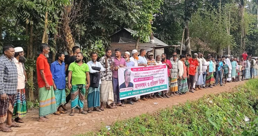 গতকাল রবিবার (১ ডিসেম্বর) বিকেলে কলাকান্দা গ্রামের বাইতুল সালাম জামে মসজিদ ও কবরস্থানর সামনে মানববন্ধন ও প্রতিবাদ মিছিলে অংশগ্রহণ করেন ঐ গ্রামের দুই শতাধিক নারী পুরুষ।