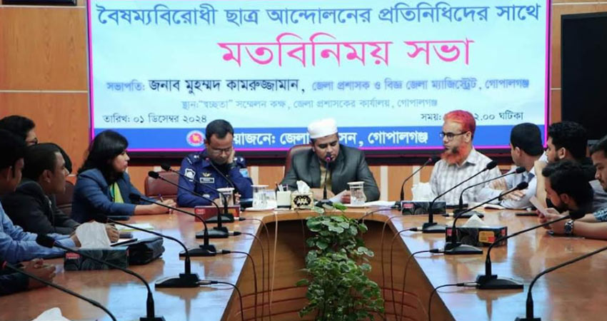 গোপালগঞ্জে বৈষম্যবিরোধী ছাত্র আন্দোলনের প্রতিনিধিদের সাথে জেলা প্রশাসনের মতবিনিময় সভা অনুষ্ঠিত হয়েছে গতকাল রোববার।