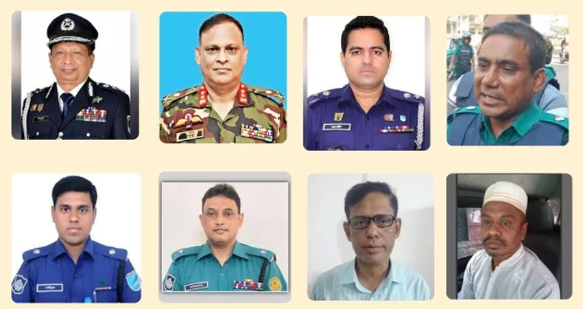 আট কর্মকর্তা হলেন– সাবেক পুলিশ প্রধান চৌধুরী আবদুল্লাহ আল-মামুন, এনটিএমসির সাবেক মহাপরিচালক মেজর জেনারেল (অব) জিয়াউল আহসান, ঢাকা জেলার সাবেক পুলিশ সুপার মো. আব্দুল্লাহ আল কাফি, মিরপুর ডিএমপির সাবেক ডিসি মো. জসিম উদ্দিন মোল্লা, ঢাকার সাবেক অতিরিক্ত সুপার (সাভার সার্কেল) মো. শাহিদুর ইসলাম, যাত্রাবাড়ী থানার সাবেক ওসি আবুল হাসান, গুলশান থানার সাবেক ওসি মাজহারুল হক এবং ঢাকা উত্তর ডিবির সাবেক পরিদর্শক মো. আরাফাত হোসেন।