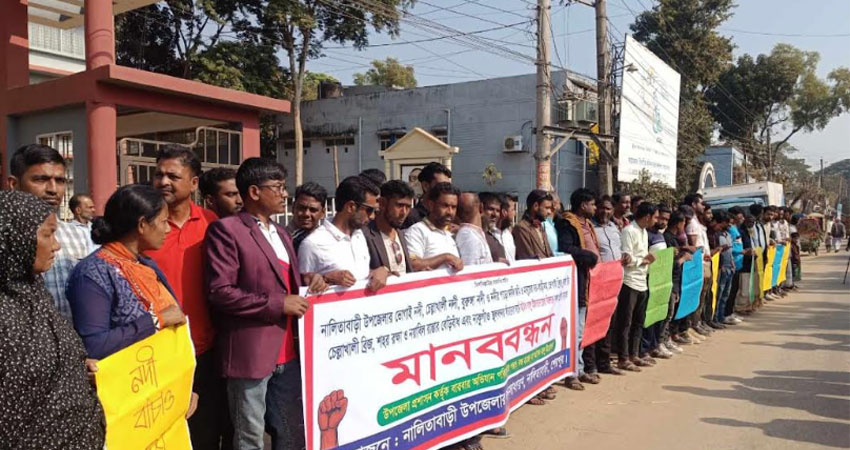 গতকাল বৃহস্পতিবার (২৬ ডিসেম্বর) উপজেলা পরিষদের সামনে বালু মহালের ইজারা বাতিলের দাবিতে মানববন্ধন করেছে সাধারণ জনগণ। এসময় ভোগাই ও চেল্লাখালী নদীর বালুমহালের ইজারা বাতিলসহ সবধরনের অবৈধ বালু উত্তোলন বন্ধের দাবি জানান তারা।