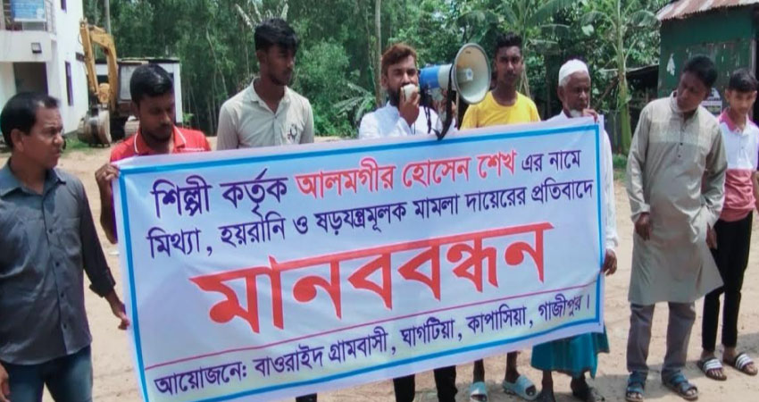 গাজীপুরের কাপাসিয়া উপজেলার ঘাগুটিয়া ইউনিয়নের বাওরাইদ এলাকার মো: আলমগীর হোসেন শেখ (৪৪) এর বিরুদ্ধে শিল্পী আক্তার কর্তৃক মিথ্যা, হয়রানি ও ষড়যন্ত্রমূলক মামলা দায়েরের প্রতিবাদে গ্রামবাসীর আয়োজনে মানববন্ধন অনুষ্ঠিত হয়েছে।