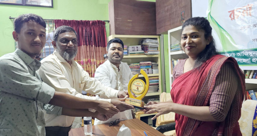 গ্রন্থাগারের পক্ষ থেকে শুভেচ্ছা স্মারক গ্রহনের পর সেরা প্রতিযোগিদের পুরষ্কার ও সনদপত্র তুলে দেন উপজেলা নির্বাহী কর্মকর্তা ফারজানা আক্তার ববি।