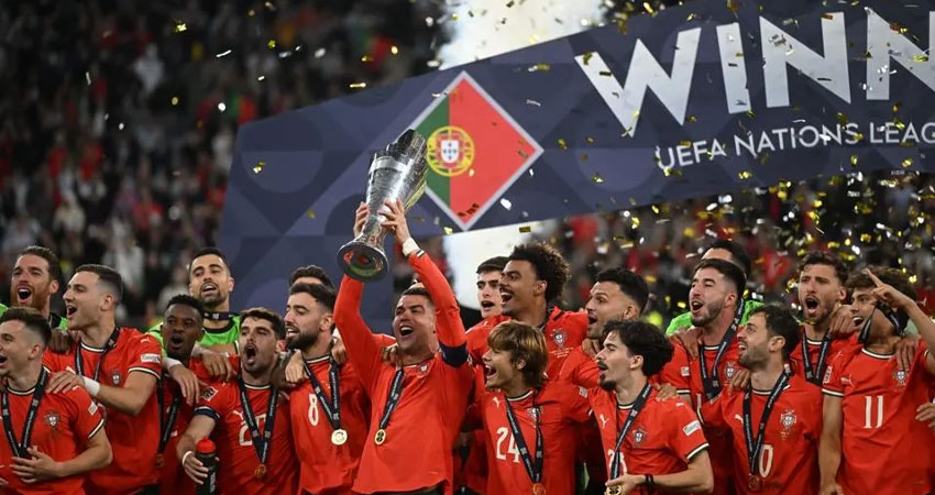 তীব্র প্রতিদ্বন্দ্বিতাপূর্ণ ম্যাচে স্পেনকে হারিয়ে উয়েফা নেশনস লিগের শিরোপা নিজের ঘরে তুলল পর্তুগাল। মিউনিখের আলিয়াঞ্জ অ্যারেনায় টাইব্রেকারে ৫-৩ গোলে স্পেনকে হারিয়েছে ক্রিস্টিয়ানো রোনালদোর দল।