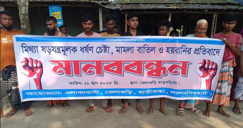 লালমনিরহাটের হাতীবান্ধায় এক প্যারালাইজড রোগীর বিরুদ্ধে ধর্ষণ চেষ্টার মামলা করার প্রতিবাদে মানববন্ধন করেছে এলাকাবাসী। বুধবার বিকেলে উপজেলার ভেলাগুড়ী ইউনিয়নের ছাতুর ডিগী বাজারে এ মানববন্ধন অনুষ্ঠিত হয়েছে।