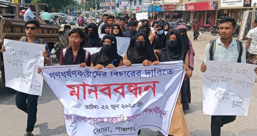 পঞ্চগড়ের বোদায় কলেজ শিক্ষার্থীকে গণধর্ষণের অভিযোগে বিচারের দাবিতে মানববন্ধন ও বিক্ষোভ মিছিল অনুষ্ঠিত হয়েছে। রবিবার (২২ জুন) বিকালে বোদা কেন্দ্রীয় শহীদ মিনারে পাথরাজ সরকারি কলেজের শিক্ষার্থীদের ব্যানারে শিক্ষার্থীরা ঘন্টাব্যাপি এই মানবন্ধন কর্মসুচি পালন করে।