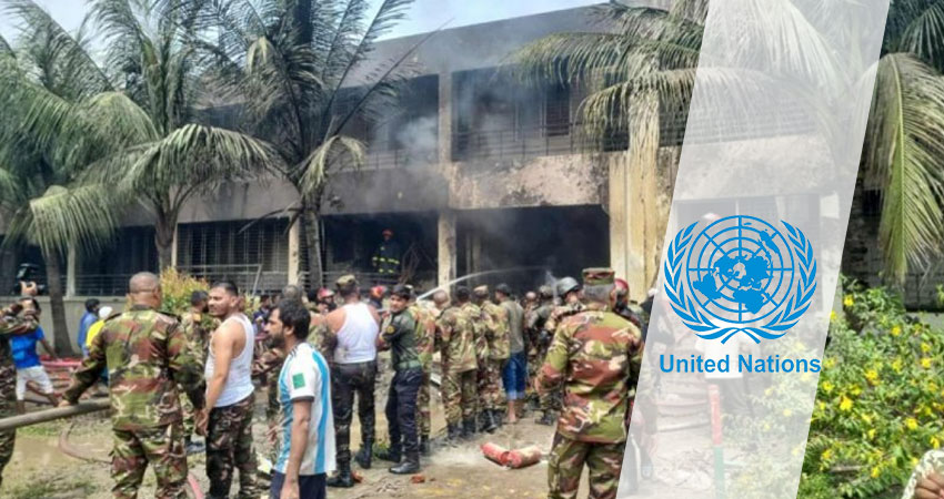 জাতিসংঘের বার্তায় উল্লেখ করা হয়, ঢাকার উত্তরায় মাইলস্টোন স্কুল অ্যান্ড কলেজ ক্যাম্পাসে বাংলাদেশ বিমান বাহিনীর একটি প্রশিক্ষণ বিমান বিধ্বস্তের ঘটনায় জাতিসংঘের বাংলাদেশ মিশন আন্তরিক সমবেদনা প্রকাশ করছে। এ ঘটনায় ক্ষতিগ্রস্তদের এবং তাদের পরিবারের প্রতি সমবেদনা জানাচ্ছে।
