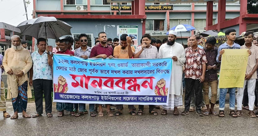 উদ্ধারকৃত খাস জমিতে বাস্তবায়নাধীন খেলার মাঠ দখল করে হাল চাষ ও কাঁটা তারের বেড়া স্থাপনের প্রতিবাদে মানববন্ধন অনুষ্ঠিত হয়েছে। গতকাল রোববার শেরপুরের নালিতাবাড়ী উপজেলা পরিষদের সামনে এ আয়োজন করেন কলসপাড় ইউনিয়নের তারাকান্দা গ্রামের সচেতন নাগরিক সমাজ।