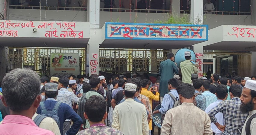 আজ সোমবার বেলা সাড়ে ১১ টায় বিশ্ববিদ্যালয়ের প্রশাসন ভবন চত্বরে আল কুরআন অ্যান্ড ইসলামিক স্টাডিজ বিভাগের নেতৃত্বে অবস্থান কর্মসূচি করেছে বিশ্ববিদ্যালয়ের শিক্ষার্থীরা। এতে শাখা ছাত্রদল, ছাত্রশিবির, ছাত্র ইউনিয়ন, ছাত্র আন্দোলন, জমিয়তে তালাবাসহ বিভিন্ন ছাত্রসংগঠন অংশ নেয়। এর আগে বেলা ১১ টায় শিক্ষার্থীরা বিশ্ববিদ্যালয়ের বটতলা থেকে বিক্ষোভ মিছিল বের করে শিক্ষার্থীরা। পরে মিছিলটি ক্যাম্পাসের বিভিন্ন সড়ক প্রদক্ষিণ করে প্রশাসন ভবন চত্বরে শেষ হয়।