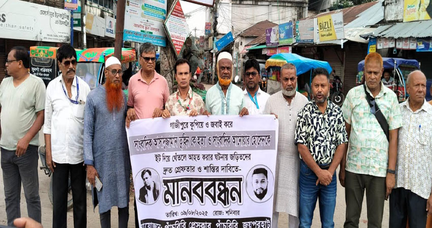 গাজীপুর মহানগরের চান্দনা চৌরাস্তায় দৈনিক প্রতিদিনের কাগজ পত্রিকার স্টাফ রির্পোটার আসাদুজ্জামান তুহিনকে প্রকাশ্যে নৃশংসভাবে হত্যা ও দৈনিক বাংলাদেশের আলো পত্রিকার সাংবাদিক আনোয়ার হোসেনকে পুলিশের সামনে সন্ত্রাসী কর্তৃক ইট দিয়ে মাথা থেঁতলিয়ে আহত করার প্রতিবাদে মানববন্ধন কর্মসূচী পালন করেছে স্থানীয় সাংবাদিক মহল।