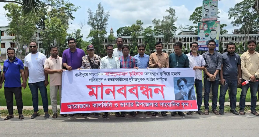 গাজীপুরের সাংবাদিক আসাদুজ্জামান তুহিনকে নৃশংসভাবে কুপিয়ে হত্যার প্রতিবাদে ও দোষীদের বিচারের দাবিতে মাদারীপুরের কালকিনিতে মানববন্ধন অনুষ্ঠিত হয়েছে।
