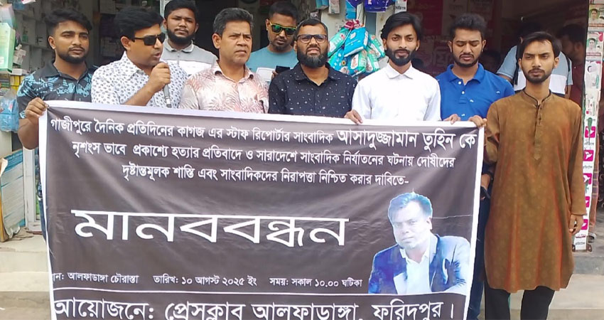 সাংবাদিক আসাদুজ্জামান তুহিনকে নৃশংসভাবে হত্যার প্রতিবাদ এবং সারা দেশে সাংবাদিকদের ওপর ক্রমবর্ধমান হামলা-নির্যাতনের বিরুদ্ধে প্রতিবাদ জানিয়ে আলফাডাঙ্গা সাংবাদিক সমাজ আজ রোববার উপজেলা চৌরাস্তায় মানববন্ধন কর্মসূচী পালন করেছে।