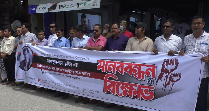 গাজীপুরের সাংবাদিক আসাদুজ্জামান তুহিন হত্যার প্রতিবাদে মানিকগঞ্জ প্রেসক্লাবের উদ্যোগে মানববন্ধন কর্মসূচি অনুষ্ঠিত হয়েছে। আজ সোমবার সকাল ১০ টায় প্রেসক্লাব চত্বরে অনুষ্ঠিত মানববন্ধন জেলার বিভিন্ন গণমাধ্যমে কর্মরত সাংবাদিকরা অংশ নেন।