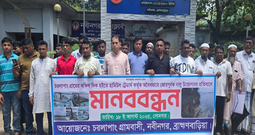 ব্রাহ্মণবাড়িয়ার নবীনগরে ড্রেজার মেশিন বসিয়ে অবৈধভাবে বালু উত্তোলনের বিরুদ্ধে ফুঁসে উঠেছে স্থানীয় গ্রামবাসী। আজ সোমবার দুপুরে উপজেলা প্রেসক্লাব চত্বরে চরলাপাং গ্রামের শতাধিক মানুষ মানববন্ধন কর্মসূচি পালন করে। পরে উপজেলা নির্বাহী অফিসারের (ইউএনও) কাছে লিখিত স্মারকলিপি প্রদান করা হয়।