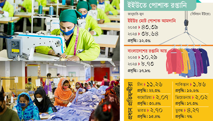 এই উল্লেখযোগ্য প্রবৃদ্ধি ইইউর বাজারে দ্বিতীয় বৃহত্তম পোশাক সরবরাহকারী হিসেবে বাংলাদেশের অবস্থানকে আরও সুদৃঢ় করেছে। তবে এই বাজারে প্রধান প্রতিদ্বন্দ্বী হয়ে দাঁড়িয়েছে এশিয়ার দেশ চীন ও কম্বোডিয়া। এ বছর ইইউর বাজারে চীন তার সর্বোচ্চ রপ্তানিকারক অবস্থান ধরে রেখেছে। দেশটির রপ্তানি ২২.৩ শতাংশ বেড়ে দাঁড়িয়েছে ১১.২৬ বিলিয়ন ইউরোতে। অপরদিকে কম্বোডিয়া সবচেয়ে দ্রুত প্রবৃদ্ধি অর্জন করেছে। তাদের রপ্তানি ৩০.৪ শতাংশ বৃদ্ধি পেয়ে ২.০৭ বিলিয়ন ইউরোতে পৌঁছেছে।