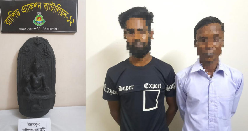 র্যাব-১২ কোম্পানী কমান্ডার অতিরিক্ত পুলিশ সুপার দীপংকর ঘোষ জানান, গোপন সংবাদের ভিত্তিতে অভিযান মহেশপুর গ্রামের পলাতক আসামি মিরাজ ফকিরের বাড়ীতে অভিযান চালানো হয়। এসময় তার ঘরের মধ্য থেকে ৩১.৫৪০ কেজি ওজনের যার দৈর্ঘ্য ২৪ ইঞ্চি এবং প্রস্থ ১২ ইঞ্চি কস্টি পাথরের মুর্তি উদ্ধার করা হয়। এ সময় ওই দুইজনকে আটক করা হয়। এ ঘটনায় উল্লাপাড়া থানায় মামলা দায়ের করা হয়েছে।