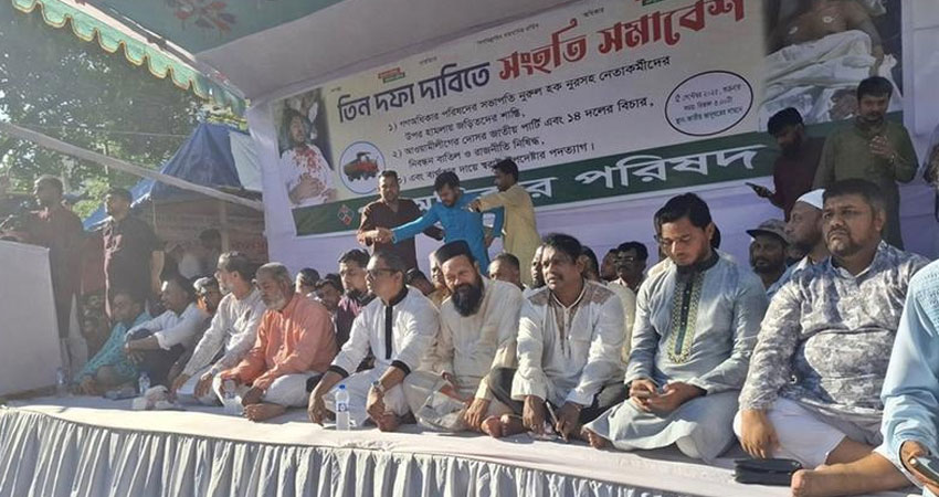গণঅধিকার পরিষদের সভাপতি নুরুল হক নুরসহ নেতাকর্মীদের ওপর হামলায় জড়িতদের শাস্তিসহ তিন দফা দাবিতে গণঅধিকার পরিষদের সংহতি সমাবেশ চলছে।