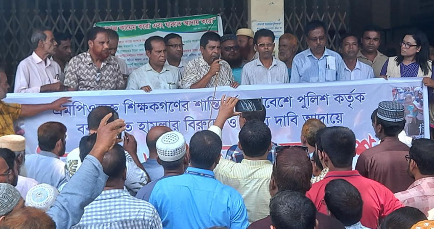 এ সময় বক্তারা বলেন, এমপিওভুক্ত শিক্ষা প্রতিষ্ঠানের শিক্ষক-কর্মচারীরা তাদের ন্যায্য দাবি আদায়ের জন্য জাতীয় প্রেসক্লাবের সামনে গত সোমবার পূর্বঘোষিত অবস্থান কর্মসূচিতে অংশ নেন। ওই দিন দুপুরের দিকে হঠাৎ শান্তিপূর্ণ কর্মসূচিতে পুলিশ শিক্ষকদের লাঠিপেটাসহ সাউন্ড গ্রেনেড ও জলকামান নিক্ষেপ করেন। এতে বেশ কয়েকজন শিক্ষক আহত হন। এ ন্যায্য দাবি আদায়ের জন্য রাজপথে দাঁড়ানো শিক্ষকদেরকে ফ্যাসিস্ট কায়দায় নির্যাতন করা হয়েছে। যারা এ ঘটনা ঘটিয়েছে তাদের শনাক্ত করে দ্রæত আইনের আওতায় আনার দাবি জানান বক্তারা।