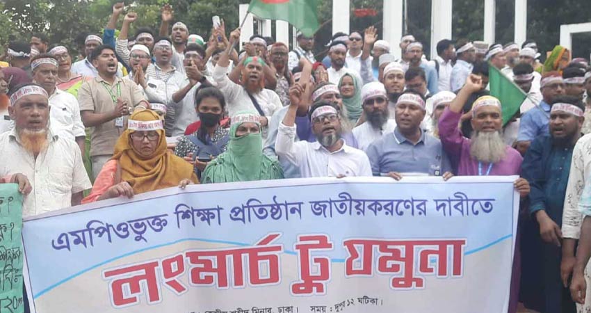 মূল বেতনের ২০ শতাংশ বাড়ি ভাড়াসহ তিন দফা দাবিতে বেসরকারি শিক্ষাপ্রতিষ্ঠানের এমপিওভুক্ত শিক্ষক-কর্মচারীরা টানা পঞ্চম দিনের মতো আন্দোলন চালিয়ে যাচ্ছেন। আজ দাবি আদায় না হলে ‘মার্চ টু যমুনা’ কর্মসূচি পালন করবেন আন্দোলনকারীরা। এরই অংশ হিসেবে লং মার্চের প্রস্তুতি নিচ্ছেন বলে জানিয়েছেন শিক্ষকরা।