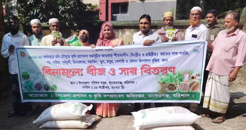 বরিশালের বাকেরগঞ্জ উপজেলায় ২০২৫-২০২৬ অর্থবছরে রবি মৌসুম কৃষি প্রণোদনা কর্মসূচির আওতায় ক্ষুদ্র ও প্রান্তিক কৃষকদের মধ্যে বিনামূল্যে শীতকালীন (ইনব্রিড ও হাইব্রিড) জাতের শাকসবজি, গম, সরিষা, সূর্যমুখী, চিনা বাদাম, সয়াবিন, মুগ, মসুর, খেসারি ও ফেলন উৎপাদন বৃদ্ধির জন্য বিনামূল্যে বীজ ও সার বিতরণ করা হয়েছে।