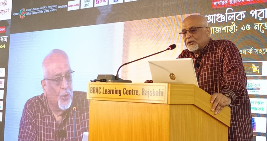 উপস্থিত অংশগ্রহণকারীদের মতামতের প্রসঙ্গ টেনে তিনি বলেন, রাজশাহীকে কেন্দ্র করে স্থানীয় অন্তত ৪টি বড় বড় বিষয় উঠে এসেছে। একটি হলো রাজশাহী যে মরুকরণ, তিস্তা এবং অন্যান্য নদীতে এখানে যে পানির ক্ষেত্রে সংকট সেটাকে নিরসনের বিষয়। দ্বিতীয়ত, এই অঞ্চলে যে জ্বালানির সংকট রয়েছে গ্যাসসহ অন্যান্য ব্যাপারে। তৃতীয়ত, যোগাযোগ ব্যবস্থা, রাজশাহীর সঙ্গে অন্যান্য অঞ্চলের যোগাযোগ ব্যবস্থা এবং চতুর্থ এখানে শিল্প নাই, বিশেষ করে কৃষিশিল্পের ব্যাপারে অনেকেই গুরুত্ব আরোপ করেছেন। স্বাস্থ্যসেবা, মানসম্পন্ন শিক্ষা, যে সমস্ত দরিদ্র মানুষের সামাজিক সুরক্ষা ইত্যাদির বিষয় আছে, কিন্তু সবচেয়ে লক্ষণীয় যে আলোচনাটা এসেছে সেটা হলো নিরাপত্তার আলোচনা। এটা শুধু অর্থনৈতিক নিরাপত্তার বিষয় না। এটা শুধু আর্থিক অন্যান্য নিরাপত্তার বিষয় না। সামাজিক নিরাপত্তা, সাংস্কৃতিক নিরাপত্তা এবং ব্যবসার ক্ষেত্রে নিরাপত্তা ইত্যাদির বিষয়টি খুব গুরুত্ব সহকারে এসেছে।