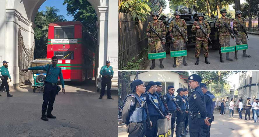 সুপ্রিম কোর্টের চারপাশ কড়া নিরাপত্তায় মোড়ানো হয়েছে। গেটের সামনে সেনাবাহিনীকে অবস্থান নিতে দেখা গেছে। আর আন্তর্জাতিক অপরাধ ট্রাইব্যুনালের সামনে ও ভেতরে পুলিশ র্যাবসহ আইনশৃঙ্খলা বাহিনীর নিরাপত্তা জোরদার করা হয়েছে।