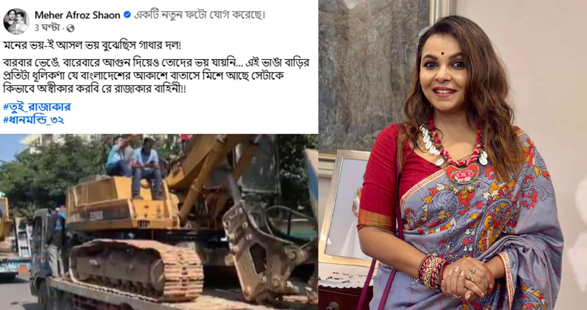 রাজধানীর ধানমন্ডি ৩২ নম্বরের দিকে বুলডোজার নিয়ে যাওয়ার বিষয়টি তুলে ধরেছেন অভিনেত্রী মেহের আফরোজ শাওন। সোমবার (১৭ নভেম্বর) ফেসবুকে দেওয়া এক পোস্টে ক্ষোভ জানিয়েছেন তিনি।