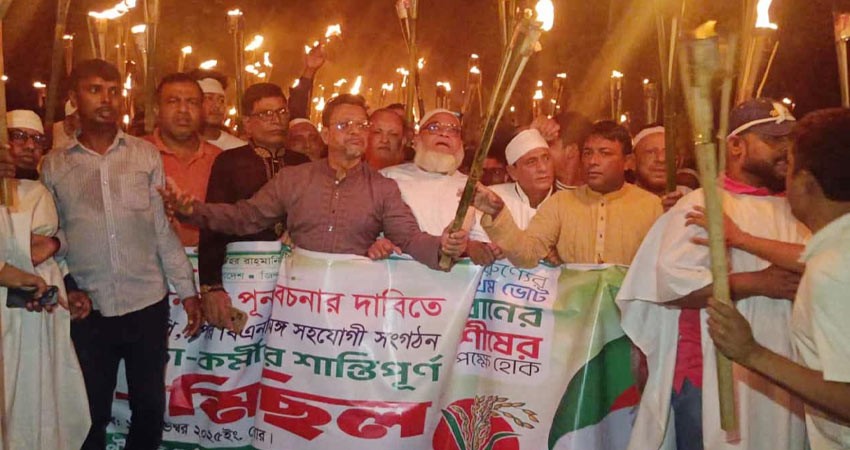 ব্রাহ্মণবাড়িয়া-৪ (কসবা-আখাউড়া) আসনে বিএনপির মনোনয়ন পাওয়া প্রার্থী বদলের দাবিতে মশাল মিছিল অনুষ্ঠিত হয়েছে। আজ বুধবার সন্ধ্যায় আখাউড়ায় ঢাকা-আগরতলা সড়কে মনোনয়নবঞ্চিত বিএনপি নেতা কবির আহমেদ ভূইয়ার কর্মী-সমর্থকরা কাফনের কাপড় পরে এই কর্মসূচি পালন করেন। পরে নারায়ণপুর মোড়ে গিয়ে এক বিক্ষোভ সমাবেশ অনুষ্ঠিত হয়।