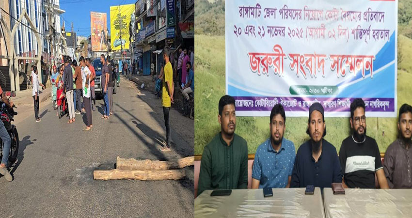 রাঙ্গামাটি জেলা পরিষদের অধীনে শিক্ষক নিয়োগে কোটা বৈষম্যের প্রতিবাদে বৃহস্পতিবার (২০ নভেম্বর) সকাল ৬টা থেকে শুক্রবার (২১ নভেম্বর) সন্ধ্যা ৬টা পর্যন্তগোটা জেলায় সড়ক ও নৌ পথে শান্তিপূর্ণ হরতাল পালিত হবে। বুধবার (১৯ নভেম্বর) বিকেলে জেলা শহরের একটি রেস্তোরাঁয় ‘কোটাবিরোধী ঐক্যজোট, সাধারণ শিক্ষার্থী ও সচেতন নাগরিকবৃন্দে’র ব্যানারে আয়োজিত সংবাদ সম্মেলন থেকে এ হরতালের ডাক দেওয়া হয়। তবে জরুরি সেবার যানবাহন এ হরতালের আওতামুক্ত থাকবে।