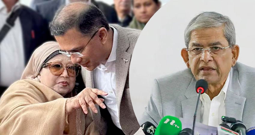 বিএনপি চেয়ারপারসন খালেদা জিয়াকে বিদেশে নেয়ার মতো শারীরিক অবস্থা পর্যবেক্ষণ করে ছেলে তারেক রহমান দেশে ফেরার সিদ্ধান্ত নেবেন। পরিস্থিতি অপরিবর্তিত থাকলে শিগগিরই তিনি দেশে ফিরবেন বলে আশা প্রকাশ করেছেন বিএনপির মহাসচিব মির্জা ফখরুল ইসলাম আলমগীর।