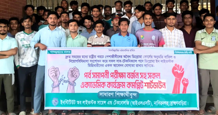 ব্রাহ্মণবাড়িয়ার নাসিরনগর উপজেলায় অবস্থিত ইনস্টিটিউট অব লাইভস্টক সায়েন্স অ্যান্ড টেকনোলজি (আইএলএসটি) ক্যাম্পাসে গত ২১ ডিসেম্বর রোববার শিক্ষার্থীরা তাদের দীর্ঘদিনের দাবি আদায়ে ক্লাস-পরীক্ষা বর্জন করে সম্পূর্ণ শাটডাউন কর্মসূচি পালন করেছেন। এই কর্মসূচির অংশ হিসেবে তারা ক্যাম্পাসের সকল একাডেমিক কার্যক্রম বন্ধ রেখে বিক্ষোভ মিছিল বের করেন এবং সমাবেশ করে ক্ষোভ প্রকাশ করেন। সমাবেশে বক্তব্য রাখেন শিক্ষার্থী মোহাম্মদ কামরুল ইসলাম সৈকত, হামিম ইসলাম, তাহমিদ নিশাত, জিহাদুল গাজী, আবদুল আউয়াল আবিরসহ অনেকে। বক্তারা সরকারের কাছে রাষ্ট্রীয় অর্থায়নে পরিচালিত ভেটেরিনারি ট্রেনিং ইনস্টিটিউটগুলোতে (ভিটিআই) পেশাজীবীদের জন্য চালু অবৈধ ডিপ্লোমা কোর্স অবিলম্বে বাতিলের দাবি জানান। পাশাপাশি প্রাণিসম্পদ অধিদপ্তরের নিয়োগ বিধিমালা-২০২৩ সংশোধন করে সকল সাব-টেকনিক্যাল পদে ‘ডিপ্লোমা ইন লাইভস্টক’ ডিগ্রিধারীদের একক নিয়োগযোগ্যতা নিশ্চিত করে দ্রুত প্রজ্ঞাপন জারির আহ্বান জানান। শিক্ষার্থীরা সতর্ক করে বলেন, আজকের মধ্যে লিখিত প্রজ্ঞাপন না জারি হলে তারা ক্লাস-পরীক্ষা বর্জনসহ শাটডাউন কর্মসূচি অব্যাহত রাখবেন।