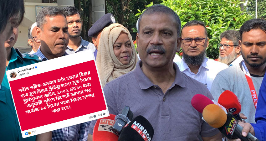 আসিফ নজরুল তার পোস্টে লেখেন, ‘শহিদ শরিফ ওসমান হাদি হত্যার বিচার হবে দ্রুত বিচার ট্রাইব্যুনালে। দ্রুত বিচার ট্রাইব্যুনাল আইন, ২০০২ এর ১০ ধারা অনুযায়ী পুলিশ রিপোর্ট আসার পর সর্বোচ্চ ৯০ দিনের মধ্যে বিচার সম্পন্ন করা হবে।’