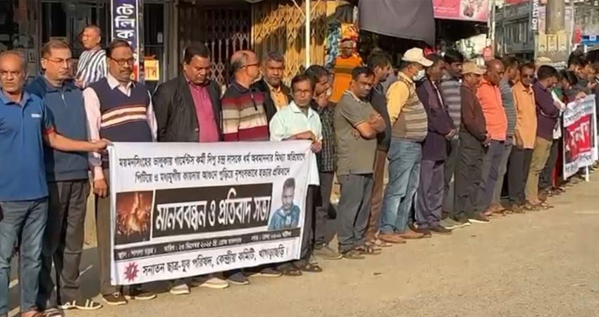ময়মনসিংহের ভালুকায় গার্মেন্টস কর্মী দিপু চন্দ্র দাসকে আগুনে পুড়িয়ে নৃশংসভাবে হত্যার প্রতিবাদে খাগড়াছড়িতে মানববন্ধন ও প্রতিবাদ সভা হয়েছে। আজ মঙ্গলবার বিকেলে খাগড়াছড়ি সনাতনী সমাজের উদ্যোগে শহরের শাপলা চত্ত্বরে এ কর্মসুচির আয়োজন করা হয়।