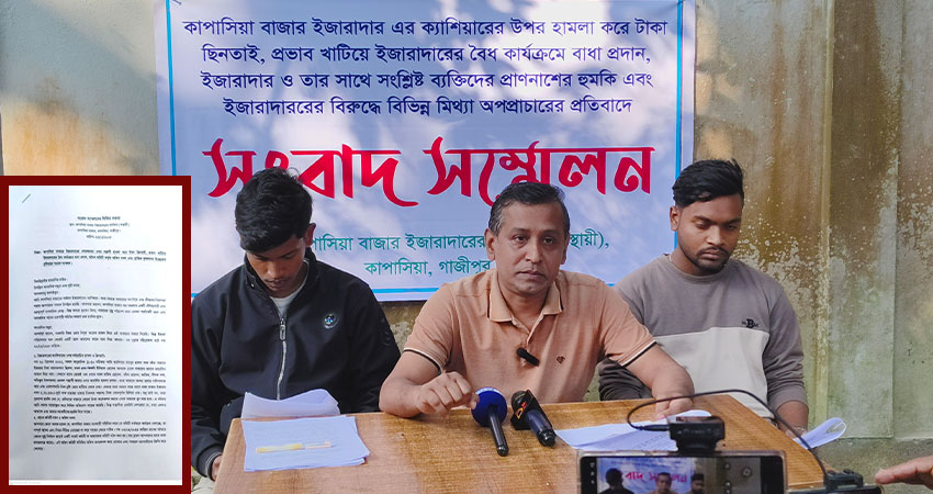 গাজীপুরের কাপাসিয়া বাজারে ইজারাদারের ক্যাশিয়ারের ওপর হামলা, লাখ টাকা ছিনতাই এবং প্রভাব খাটিয়ে সরকারি রাজস্ব আদায়ে বাধা প্রদানের প্রতিবাদে সংবাদ সম্মেলন অনুষ্ঠিত হয়েছে। আজ বুধবার (২৪ ডিসেম্বর) সকাল ১১টায় কাপাসিয়া বাজারের বর্তমান ইজারাদারের পক্ষে ক্যাশিয়ার মাহবুব হাসান এই সংবাদ সম্মেলন করেন। লিখিত বক্তব্যে মাহবুব হাসান অভিযোগ বলেন সরকারি নিয়ম মেনে বিপুল অংকের রাজস্ব দিয়ে তারা বাজারের ইজারা নিলেও একটি স্বার্থান্বেষী মহল শুরু থেকেই কাজে বাধা দিয়ে আসছে।
