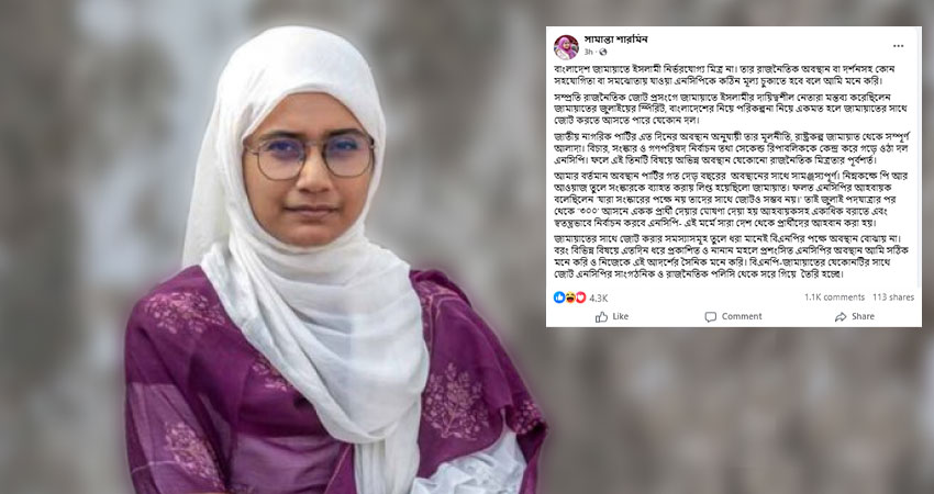 এই নিয়ে নিজের ফেসবুক অ্যাকাউন্টে দেওয়া পোস্টে সামান্তা শারমিন লিখেছেন, জামায়াতে ইসলামী নির্ভরযোগ্য রাজনৈতিক মিত্র নয়। তাদের সঙ্গে রাজনৈতিক সহযোগিতা বা সমঝোতা এনসিপির জন্য ঝুঁকিপূর্ণ সিদ্ধান্ত হতে পারে। তিনি উল্লেখ করেন, জামায়াতের জুলাইয়ের স্পিরিট বা বাংলাদেশ নিয়ে পরিকল্পনায় একমত দলগুলোই জোটে আসতে পারে বলে সম্প্রতি মন্তব্য করেছিলেন জামায়াতের নেতারা।