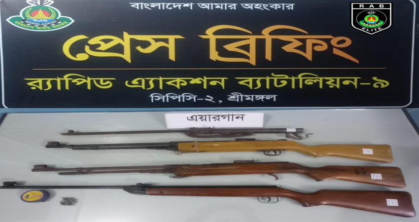 র্যাপিড এ্যাকশন ব্যাটালিয়ন র্যাব-৯, সিপিসি-২, মৌলভীবাজারের একটি আভিযানিক দল অস্ত্র উদ্ধারের বিশেষ অভিযান পরিচালনা করাকালে রোববার (৪ জানুয়ারি) রাত ১টা ৪৫ মিনিটের সময় গোপন সংবাদের ভিত্তিতে কমলগঞ্জ উপজেলার আলীনগর ইউনিয়নের কামুদপুর এলাকার একটি মেহগনি গাছ বাগানের ভিতর বাঁশ ঝাড়ের মধ্যে ব্যাপক তল্লাশী করে প্লাস্টিকের বস্তা দ্বারা মোড়ানো পরিত্যক্ত অবস্থায় ৪টি এয়ারগান ও বেগুনি রংয়ের প্লাস্টিকের কৌটার মধ্যে ২৫টি এয়ারগানের গুলি উদ্ধার করতে সক্ষম হয়। তবে এয়ারগানগুলো ও গুলির সাথে সংশ্লিষ্ট কাউকে খুঁজে পাওয়া যায়নি।