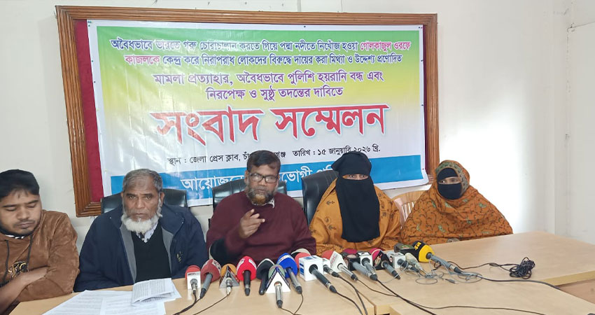 অবৈধভাবে ভারতে গরু চোরাচালানের সময় পদ্মা নদীতে নিখোঁজ হওয়া গোলকাজুল ওরফে কাজলকে কেন্দ্র করে নিরাপরাধ ব্যক্তিদের বিরুদ্ধে দায়ের করা মিথ্যা ও উদ্দেশ্যপ্রণোদিত মামলা প্রত্যাহার, পুলিশি হয়রানি বন্ধ এবং ঘটনার নিরপেক্ষ ও সুষ্ঠু তদন্তের দাবিতে সংবাদ সম্মেলন করেছে ভুক্তভোগী পরিবার। বৃহস্পতিবার দুপুরে চাঁপাইনবাবগঞ্জ জেলা প্রেস ক্লাবে এই সংবাদ সম্মেলনের আয়োজন করা হয়।