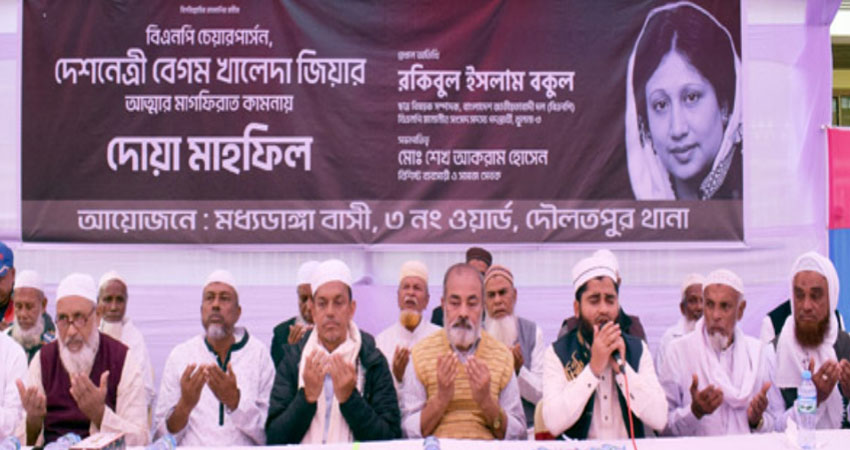 এর আগে শনিবার দুপুরে বেগম খালেদা জিয়ার রুহের মাগফিরাত কামনায় দৌলতপুরের ১ ও ৩নং ওয়ার্ডের মাঝখানে গোলকধামের মোড়ে দোয়া মাহফিল ও আলোচনা সভা অনুষ্ঠিত হয়। অনুষ্ঠানে প্রধান অতিথি হিসেবে উপস্থিত ছিলেন আলহাজ্ব রকিবুল ইসলাম বকুল। মাহফিল শেষে দেশ ও জাতির কল্যাণ কামনায় বিশেষ মোনাজাত করা হয়, যেখানে স্থানীয় বিপুল সংখ্যক সাধারণ মানুষ অংশগ্রহণ করেন।