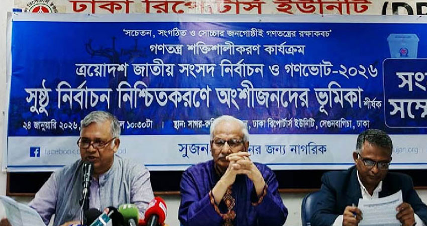 শনিবার ঢাকা রিপোর্টার্স ইউনিটির সাগর-রুনি মিলনায়তনে সুষ্ঠু নির্বাচন নিশ্চিতকরণে অংশীজনের ভূমিকা শীর্ষক এ সংবাদ সম্মেলন অনুষ্ঠিত হয়। সংবাদ সম্মেলনে সুজনের প্রধান নির্বাহী বদিউল আলম মজুমদার বক্তব্য রাখেন। সংবাদ সম্মেলনে লিখিত বক্তব্য তুলে ধরেন সুজনের কেন্দ্রীয় সমন্বয়কারী দিলীপ কুমার সরকার।