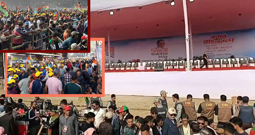জনসভা ঘিরে ভোর থেকে সমাবেশস্থলে আসতে শুরু করেন দলীয় নেতাকর্মীরা। বেলা বাড়ার সঙ্গে সঙ্গে পলোগ্রাউন্ড মাঠ ভরে যাচ্ছে। এদিকে মাইকে বারবার ঘোষণা দেওয়া হচ্ছে শৃঙ্খলা বজায় রাখার জন্য। কিন্তু মঞ্চের সামনের অংশে বসতে কর্মীদের চাপ থেমে নেই। উৎসবের আমেজে যেন কর্মীদের সবাই উচ্ছ্বসিত। জেলা, উপজেলা থেকে খণ্ড খণ্ড মিছিল নিয়ে আসছেন নেতাকর্মীরা। ব্যানার ফেস্টুনসহ মিছিলে নানা স্লোগান দিয়ে কর্মীরা প্রবেশ করছেন পলোগ্রাউন্ড মাঠে।