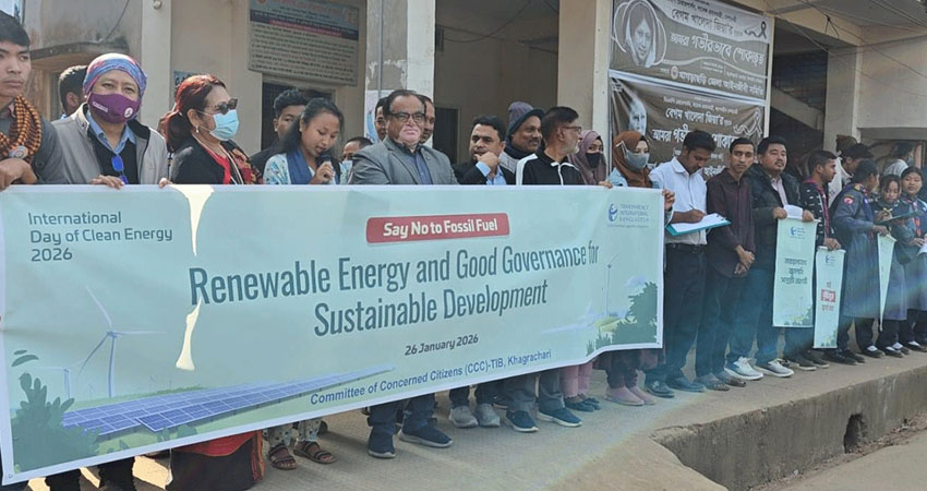 জীবাশ্ম জ্বালানিকে না বলুন” ক্লিন এনার্জি টেকসই ভবিষ্যৎ গড়ার লক্ষ্যে খাগড়াছড়িতে আন্তর্জাতিক ক্লিন এনার্জি দিবস -২০২৬ উপলক্ষে মানববন্ধন অনুষ্ঠিত হয়েছে। সোমবার সকালে খাগড়াছড়ি প্রেসক্লাবের সামনে সচেতন নাগরিক কমিটি (সনাক) ওটিআইবির উদ্যোগে মানববন্ধন অনুষ্টিত হয়। মানববন্ধনে অংশ নেন একটিভ সিটিজেন গ্রুপ (এসিজি), ইয়ুথ এনগেজমেন্ট অ্যান্ড সাপোর্ট ( ইয়েস) গ্রুপ সদস্য, নারী কল্যাণ সমিতি, জাবারাং এনজিও সহ বিভিন্ন এনজিও সদস্য ও সাধারণ শিক্ষার্থীরা।