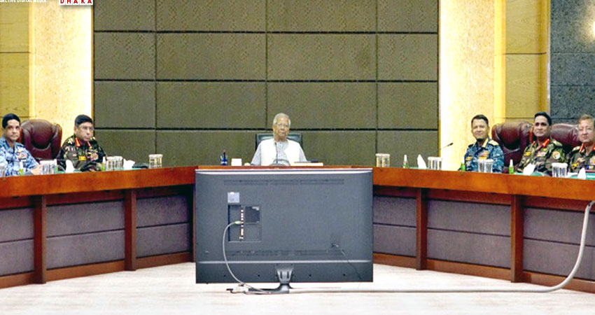 সভার শুরুতে প্রধান উপদেষ্টা দেশের বিভিন্ন প্রয়োজনে সশস্ত্র বাহিনীর গৌরবোজ্জ্বল ও দায়িত্বশীল ভূমিকার কথা উল্লেখ করেন। একইসঙ্গে দীর্ঘ সময় ধরে ধৈর্য ও পেশাদারিত্বের সাথে দেশের আইন-শৃঙ্খলা বজায় রাখার জন্য সশস্ত্র বাহিনীর প্রতি আন্তরিক ধন্যবাদ ও কৃতজ্ঞতা প্রকাশ করেন।