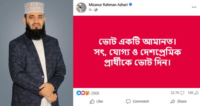 ওই পোস্টে মিজানুর রহমান আজহারী সবাইকে সত্য ও যোগ্য প্রার্থীকে ভোট দেওয়ার আহ্বান জানান। তিনি লিখেন, ‘ভোট একটি আমানত। সৎ, যোগ্য ও দেশপ্রেমিক প্রার্থীকে ভোট দিন।’