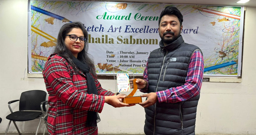 চিত্রশিল্পে সৃজনশীলতা ও নান্দনিক প্রকাশের স্বীকৃতি হিসেবে ‘স্কেচিং এক্সিলেন্স অ্যাওয়ার্ড ২০২৬’ অর্জন করেছেন তরুণ শিল্পী শায়লা সবনম। গত বৃহস্পতিবার সকালে জাতীয় প্রেসক্লাবের জহুর হোসেন চৌধুরী হলে অনুষ্ঠানে বিনোদনমূলক ও সাংস্কৃতিক প্রতিষ্ঠান বঙ্গোভাইবস এন্টারটেইনমেন্ট-এর পক্ষ থেকে তার হাতে এই সম্মাননা তুলে দেন গ্যালারী হামিদুজ্জামানের পরিচালক দিপ্র বনিক। তানিয়া হামিদের উপস্থাপনায় অনুষ্ঠানে স্বাগত বক্তব্য রাখেন এডভোকেট নাসির আহমেদ।