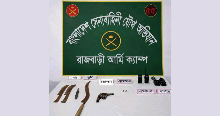 রাজবাড়ী জেলার সদর উপজেলাধীন শহীদওহাবপুর ইউনিয়নের ধুলদী জয়পুর এলাকায় গোপন সংবাদের ভিত্তিতে যৌথ অভিযান চালিয়ে একটি বিদেশি রিভালবার, গোলাবারুদ, ওয়াকিটকি ও দেশীয় অস্ত্র উদ্ধার করেছে সেনাবাহিনী। আজ শুক্রবার রাজবাড়ী সদর সেনা ক্যাম্পের নেতৃত্বে এ অভিযান পরিচালনা করা হয়। অভিযানে সাঈদ বিশ্বাসের বসতবাড়ির পাশের একটি মেহগনি বাগান থেকে অস্ত্র ও সরঞ্জামগুলো উদ্ধার করা হয়।