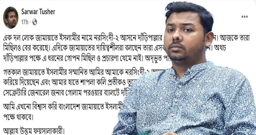 পোস্টে সারোয়ার তুষার লিখেছেন, একদল লোক জামায়াতে ইসলামীর নামে নরসিংদী-২ আসনে দাঁড়িপাল্লার পক্ষে প্রচারণা চালাচ্ছেন। আজকে তারা মিছিলও বের করেছে। এদিকে জামায়াতের দায়িত্বশীলরা বলছেন তারা এসব ব্যাপারে অবগত নন। অথচ দাঁড়িপাল্লার পক্ষে এ ধরনের গোপন মিছিল ও প্রচারণা থেমে নেই। অদ্ভুত পরিস্থিতি!
