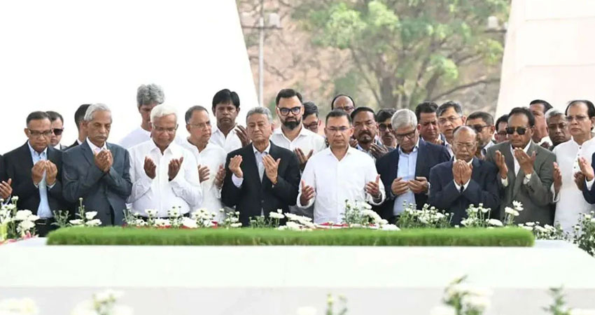 এর আগে, বেলা ১১টার দিকে সাভারের জাতীয় স্মৃতিসৌধে মহান মুক্তিযুদ্ধের বীর শহীদদের প্রতি শ্রদ্ধা নিবেদন করেন প্রধানমন্ত্রী তারেক রহমান। প্রধানমন্ত্রী হিসেবে শ্রদ্ধা জানানোর শেষে তিনি নবগঠিত মন্ত্রিপরিষদের সদস্যদের সঙ্গে নিয়ে স্মৃতিসৌধের বেদিতে পুষ্পস্তবক অর্পণ করেন। এরপর স্মৃতিসৌধের পরিদর্শন বইয়ে সই করেন তিনি। দেশের ১১তম প্রধানমন্ত্রী হিসেবে সই করেন তিনি। সেই সঙ্গে প্রচলন মেনে স্মৃতিসৌধ প্রাঙ্গণে বৃক্ষরোপণও করেন তারেক রহমান।