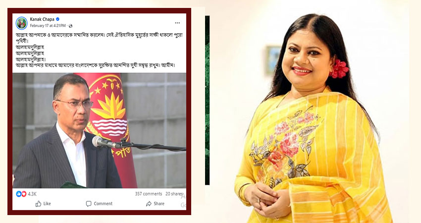 দেশের ১১তম প্রধানমন্ত্রী হিসেবে শপথ নিয়েছেন তারেক রহমান। সামাজিক যোগাযোগমাধ্যমে দেশবাসী এবং বিনোদন অঙ্গনের অনেকেই তাকে অভিনন্দন জানাচ্ছেন। জনপ্রিয় কণ্ঠশিল্পী রুমানা মোর্শেদ কনকচাঁপা নিজের ভেরিফায়েড ফেসবুক স্ট্যাটাসে নতুন প্রধানমন্ত্রীর সাফল্য এবং দেশের মঙ্গলের জন্য দোয়া করেছেন।