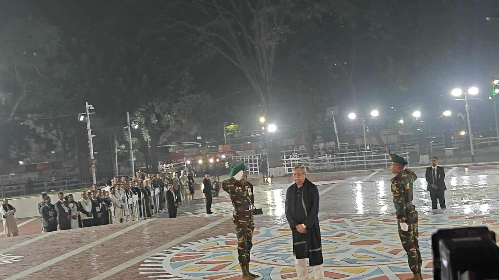 রাত বারোটা বাজার এক মিনিট আগে কেন্দ্রীয় শহীদ মিনারে যান রাষ্ট্রপতি। ফুল দিয়ে শ্রদ্ধা জানানোর পার কিছুক্ষণ নিরবে দাঁড়িয়ে থাকেন তিনি। শ্রদ্ধা জানিয়ে কেন্দ্রীয় শহীদ মিনার ত্যাগ করেন রাষ্ট্রপতি।