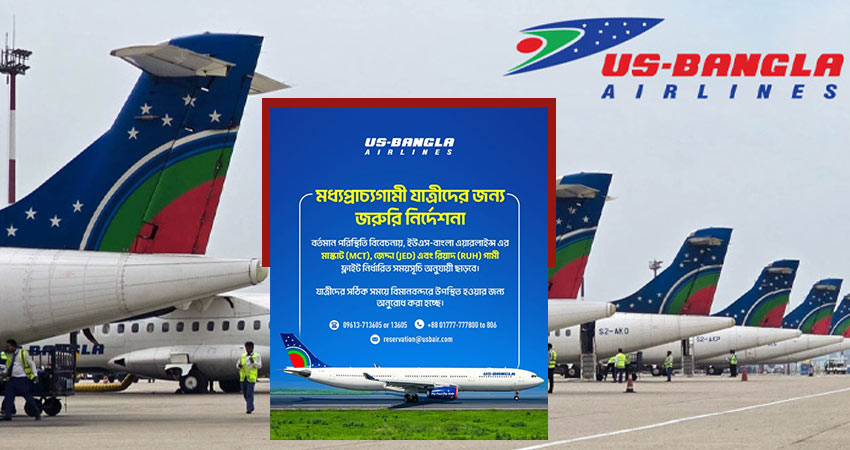 ইউএস-বাংলা জানায়, মধ্যপ্রাচ্যের সার্বিক পরিস্থিতি বিবেচনায় ইউএস-বাংলা এয়ারলাইন্স সংযুক্ত আরব আমিরাতের দুবাই, আবুধাবী, শারজাহ ও কাতারের রাজধানী দোহায় ফ্লাইট চলাচল সাময়িকভাবে স্থগিত রয়েছে। আরব আমিরাত ও কাতারে ফ্লাইট চলাচল উপযোগী হওয়া মাত্রই সম্মানিত যাত্রী সাধারণের সঙ্গে যোগাযোগ করবে ইউএস-বাংলা এয়ারলাইন্স কর্তৃপক্ষ।
